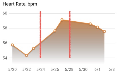 Dans la semaine du 20 mai, je tiens le choc, surpris même d’avoir un 55 le jeudi alors que je passe ma journée du mercredi à faire le taxi. Je ne la mesure pas le vendredi mais c’est déjà nettement moins bon : je me lève cassé. Arrive le week-end où je me peux enfin m’occuper de moi et le dimanche 26, je me traine toute la journée (49 mesuré au levé). Je n’arrive plus à avancer. Je me fais des longues sessions de méditation pour me recentrer mais ça me demande un vrai effort.