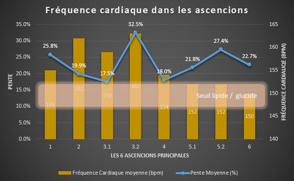- En ordonnée, une ligne brisée qui donne la pente moyenne de la côte et un diagramme en bâtons qui donne successivement les valeurs moyennes de la vitesse ascensionnelle, de la fréquence cardiaque et de la vitesse de course.