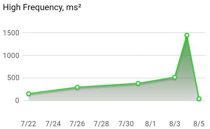Regardons le cardio maintenant et les fameuses courbes de VFC dont vous êtes maintenant familiers Les graphes montrent les mesures des deux semaines précédant la course. Les deux derniers relevés sont le matin de la course et le lendemain (premier jour de récupération). A noter que j’ai baissé progressivement la charge d’entrainement et que j’ai beaucoup dormi (j’étais en vacances toute la semaine avant la course).
