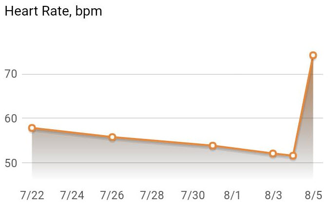 Côté fréquence cardiaque, même tendance. Là encore notez la valeur le lendemain de la course alors que le corps commence à peine sa récupération : mon système cardio-vasculaire était épuisé. J’ai vraiment tout donné la veille !
