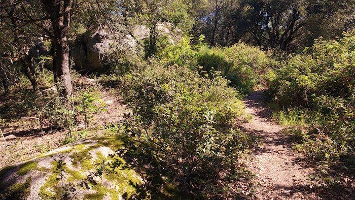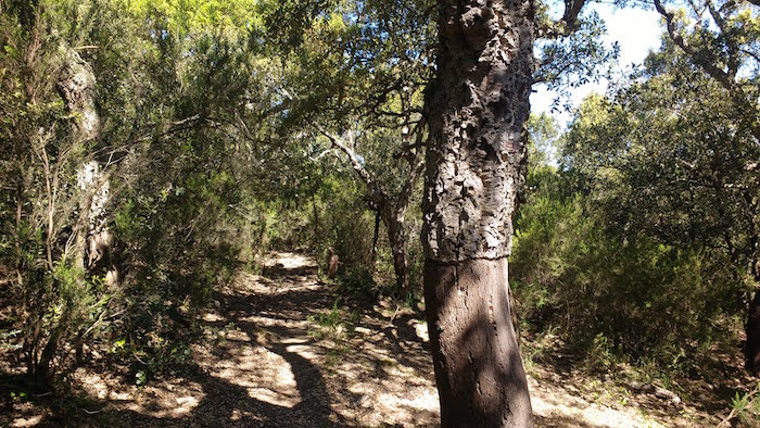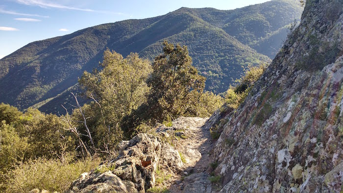 … Et une nouvelle fois, comme depuis maintenant très longtemps, je suis seul. Je sais que quatre personnes ont quitté le ravitaillement peu de temps avant moi, alors j’essaie de mettre un peu de rythme pour me joindre à eux. Et puis le prochain ravitaillement sera au Perthus, la troisième base de vie de la course au 135e kilomètre, et j’ai vraiment envie d’y arriver avant la nuit. Je les ai enfin en point de mire peu après avoir retrouvé le GR10. Le sentier mono-trace est très joueur, virevoltant de droite et de gauche dans une végétation juste dense pour masquer la vue de la courbe suivante. Une petite bosse suivie d’une petite descente en léger dévers suivie à nouveau d’une bosse … et ainsi de suite. Un régal pour le moral et un grand sourire intérieur pour me remettre en selle.