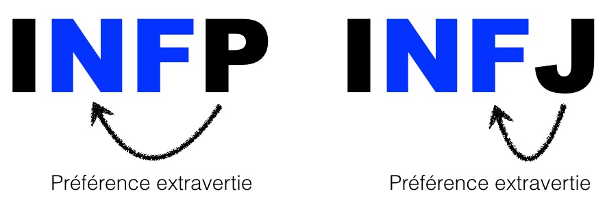 – Si c’est J, alors la 3e lettre devient extravertie. Jung dit que la 2e lettre est alors introvertie. Dans le cas d’un INFJ, on obtient F extravertie (3e lettre) notée Fe et N introvertie (2e lettre) notée Ni.