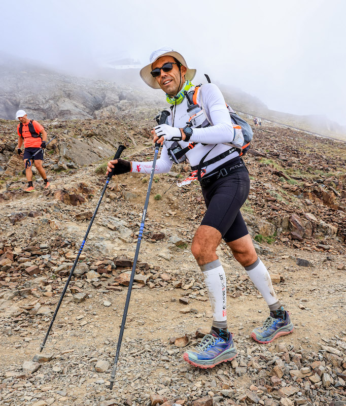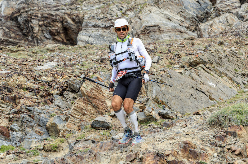 Derrière moi, deux personnes m’intriguent. Ils n’ont vraiment pas l’air jeune. Karen, une anglaise menue et voutée à la mine espiègle et Jean-Paul, les cheveux blancs et le regard alerte. J’apprendrais plus tard qu’il sont les premiers des catégories M5 (plus de 60 ans). La première finira avec une heure d’avance sur moi et le deuxième avec une heure de retard. Tous deux dégagent un mélange de force et de sérénité. Des rocs inébranlables. Des vieux routiers des montagnes. J’éprouve envers eux un très grand respect et un sentiment d’humilité.
