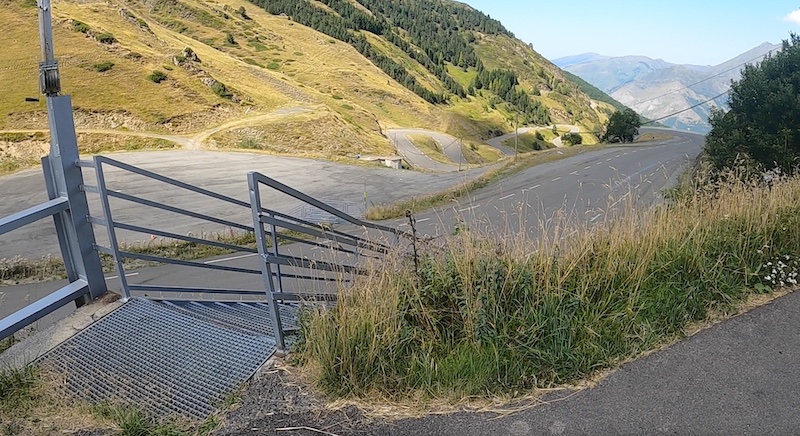 Le soleil levant dissipe les volutes de nuages et la vue sur la vallée est magnifique. Le début de la descente nous fait traverser les virages de la route tortueuse menant à Luz-Ardiden dont Aulian est le camp de base. On alterne entre bitume et hautes herbes. Pour la première fois, j’ai mal en continu, que ce soit au releveur ou à la patte d’oie.
