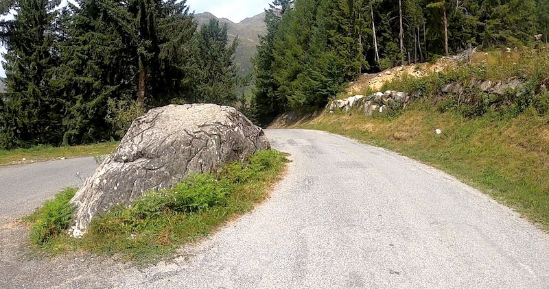 J’ai réussi à trouver une solution pour tous les obstacles rencontrés jusqu’ici. Mais là, je ne sais plus faire. Jusqu’à l’entrée dans la forêt, je ruse en m’écartant du chemin et en trouvant des passages plus cléments entre les rochers, toujours en engageant d’abord la jambe droite et en laissant trainer la jambe gauche. Je suis de moins en moins lucide. Mon appui à droite se dérobe. Je glisse, je chute, je crie. Je me relève en pleurs. C’est insupportable. Et pourtant je ne suis pas au bout de mes peines…
