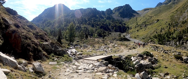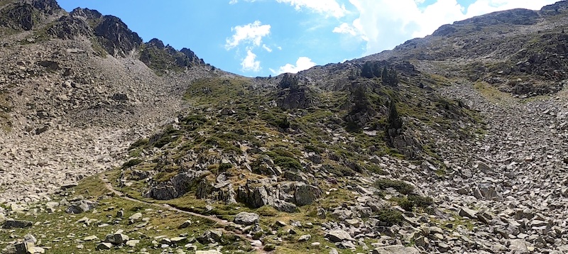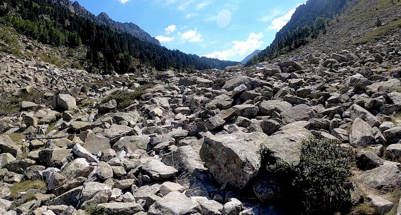 Je profite du départ d’un train de coureurs pour m’accrocher au dernier wagon. Mais dès le contournement du lac de Coueyla Gran, une courte rampe à escalader me stoppe et je vois partir avec dépit mes ex-nouveaux amis sans moi. Je n’arrive même plus à pousser sur mes bâtons pour me hisser entre les rochers et le gymkhana me fait perdre beaucoup de temps.