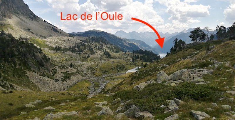 Je regarde avec effroi ce qui s’annonce : 5 kilomètres d’un chaos inextricable de rochers et de racines dans une descente tortueuse avec quelques passages acrobatiques à 20%. Je vois le lac de l’Oule, annonçant la fin du martyr. Il est si loin. Abattement…