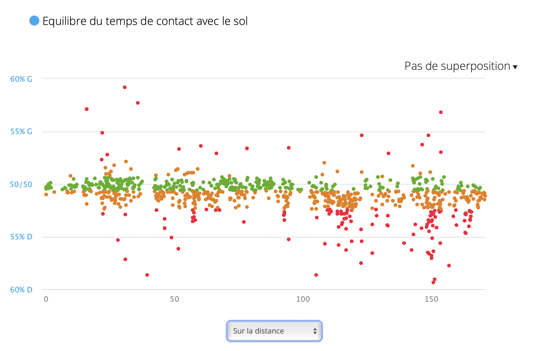 En abscisses, vous avez le kilométrage et en ordonnée la répartition du temps de contact au sol entre droite et gauche. Plusieurs leçons à retirer de ce graphique :