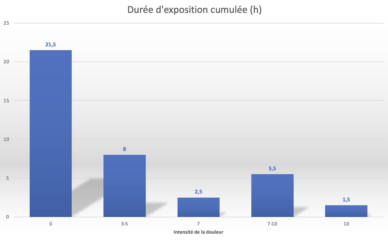 Aussi, quand je mets une note de 10, je parle d’une douleur insoutenable qui arrache cris et larmes et dont on supplie pour que ça s’arrête immédiatement. Pour bien prendre la mesure de ce que j’ai subi (et que j’ai choisi de subir !), je vous propose cet histogramme avec en abscisse l’échelle de douleur et en ordonnée la durée d’exposition cumulée à cette douleur.