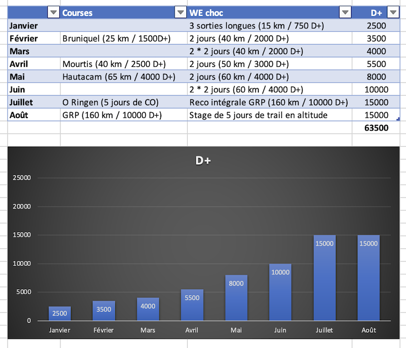 L’idée est d’arriver le jour J avec au moins 50000 mètres de dénivelé positif en respectant une progressivité.