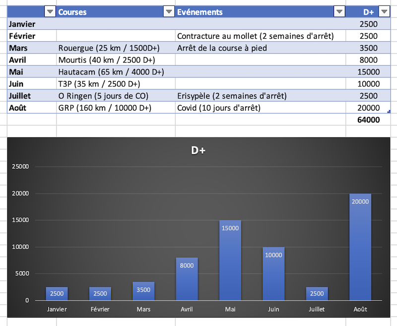 J’ai construit mon plan en positionnant d’abord les courses de préparation, puis les week-end chocs, et enfin je planifie le D+ que je cherche à atteindre par mois. En janvier 2022, ça donnait ça :