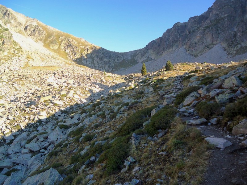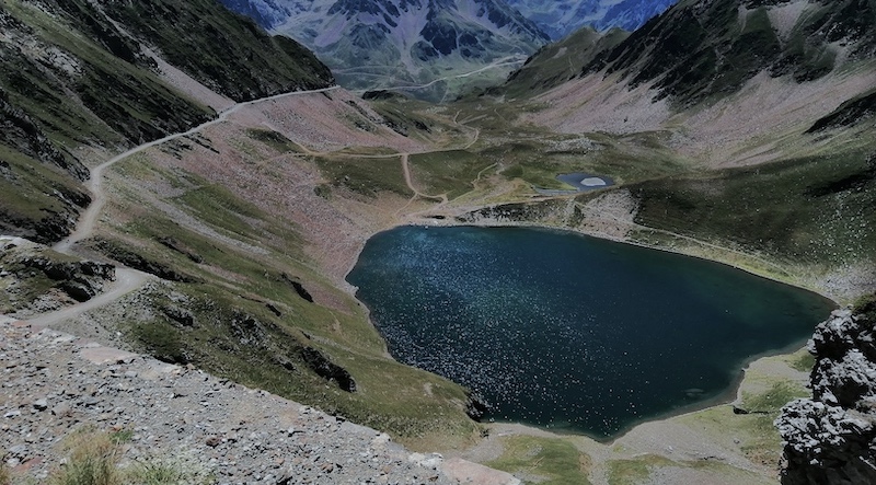 Il suffit de dégringoler 10 minutes pour sentir le vent se tarir. Le contournement du lac d’Oncet se fait paisible. Je prends un rythme tranquille, porté par la gravité, mais assez rapide pour doubler pas mal de monde.
