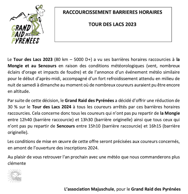 L’association Majuschule en charge de l’organisation de la course a publié un communiqué sur son site pour proposer des réductions aux coureurs qui ont subi la situation sur les 2 ravitaillements et ont été contraints d’arrêter leur course.
