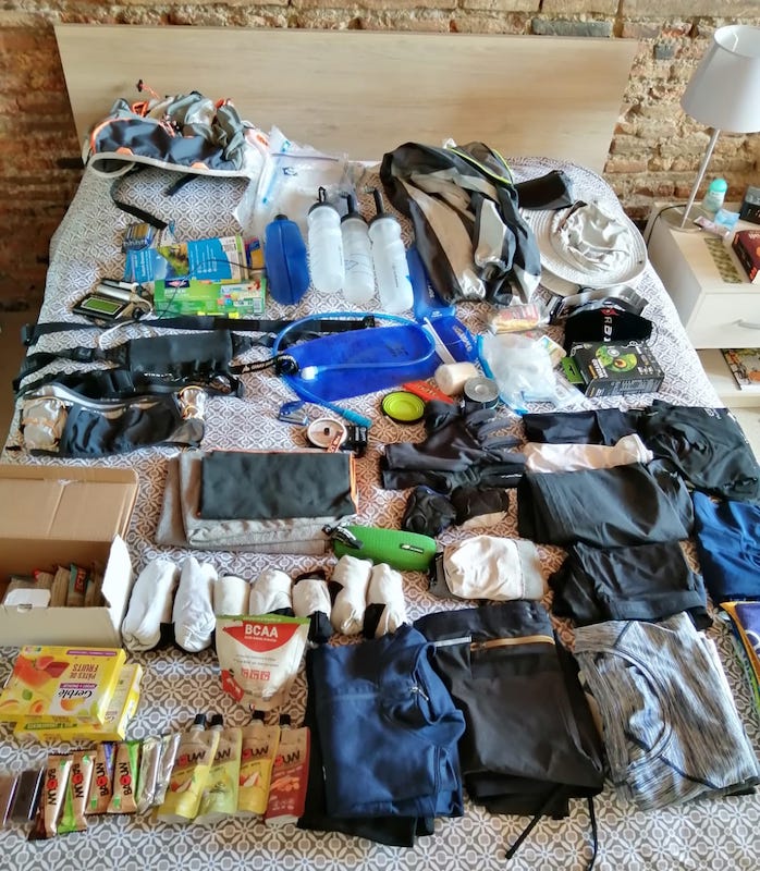 [17:06, 21/10/2023] Départ imminent de la base de 2 bras après 2 plâtrées de rougail saucisse 🤪, soins podo😣, remaniement du sac🤯Au programme, 700D+ de marches 🤬