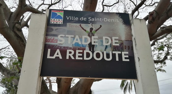François D'Haene, quadruple vainqueur de la Diagonale des Fous, à l'honneur à l'entrée du stade de la Redoute