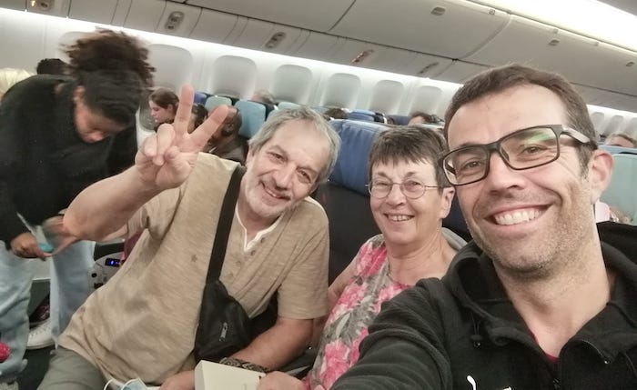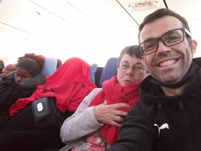 [06:45, 13/10/2023] Nuit hachée et trop courte. On a tous des têtes de déterrés dans cet avion. La clim est poussée à bloc. Autour de nous, on devine les trailers qui affichent leur CV avec leur veste et tee-shirt de finisher. Y’en a même qui font des étirements devant les hublots du centre. T’as beau être un grand baraqué, bin quand t’as pas dormi, tu ressembles à rien 😂